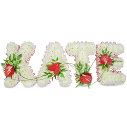 A handcrafted floral name tribute spelling out "KATE" is displayed on a pure white background, allowing the artistry of the funeral design to take centre stage. Each of the four capital letters is shaped from a tightly packed bed of white chrysanthemums, their soft petals forming a plush, cushion-like surface that suggests purity, peace, and quiet remembrance. A narrow band of pale pink ribbon traces the outer edge of every letter, its gentle sheen catching the light and adding a graceful, slightly ruffled border that feels both tender and reassuring. Within this snowy base, the florist has woven in vibrant accents: at the side of the "K" and near the foot of the "T", striking yellow-green cymbidium orchids, marked with warm red-brown throats, nestle among glossy green leaves. On the "A" and the "E", bold red anthuriums, perfectly heart-shaped and lightly gleaming, rise above the white blooms, surrounded by deep green foliage that adds depth and contrast. Slim trails of greenery, including fine tendrils and fern fronds, flow across and between the letters, gently tying the name together as one continuous tribute. The arrangement feels deeply personal, suited to a funeral or memorial service for someone called Kate whose life is being celebrated with care. It is easy to imagine this piece placed beside a coffin or framed by candles in a Hackney Marshes chapel, delivered freshly arranged from a local florist who understands the quiet, reflective atmosphere of the towpaths, canals, and green fields nearby.