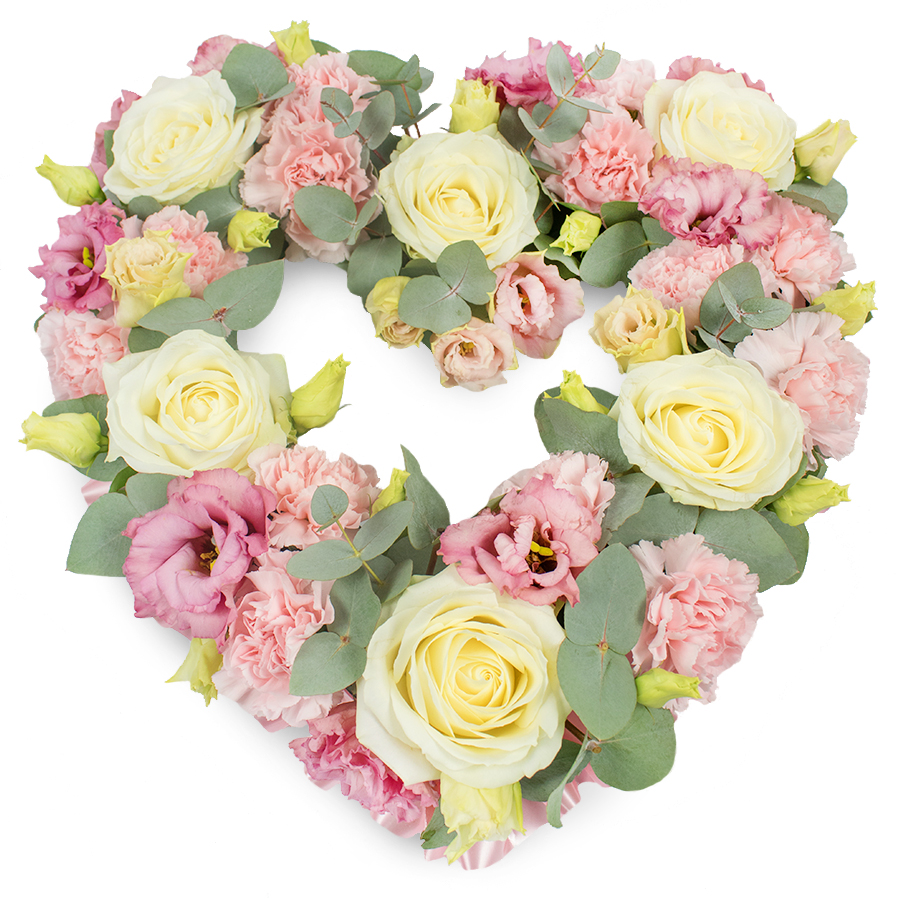 Show your love and gratitude with our heartfelt open heart floral tribute. This exquisite bouquet combines elegant white roses, delicate pink carnations, stunning pink lisianthus, and fragrant eucalyptus leaves, artfully arranged to create a unique and beautiful display.